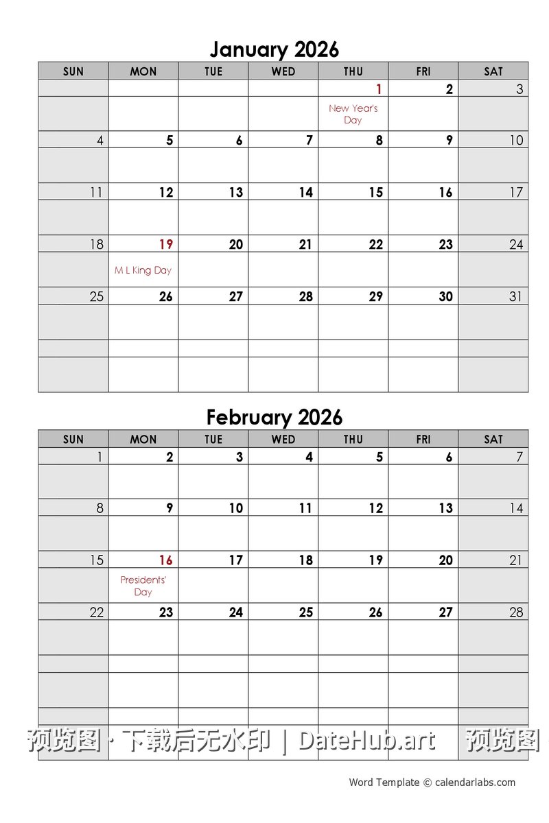 💡 提示:此日历为 2026 年版本,包含全年 12 个月份。 如需其他年份日历,请返回首页浏览更多选择。
