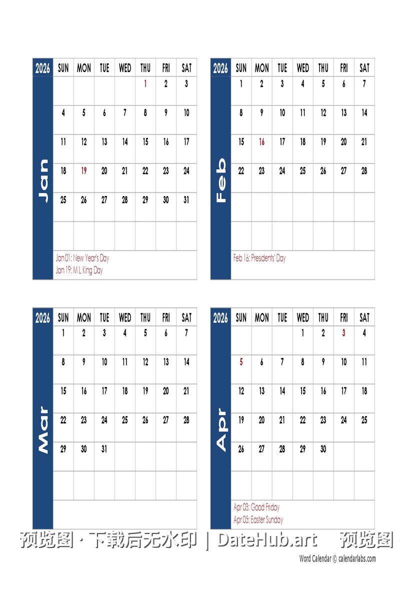 💡 提示:此日历为 2026 年版本,包含全年 12 个月份。 如需其他年份日历,请返回首页浏览更多选择。