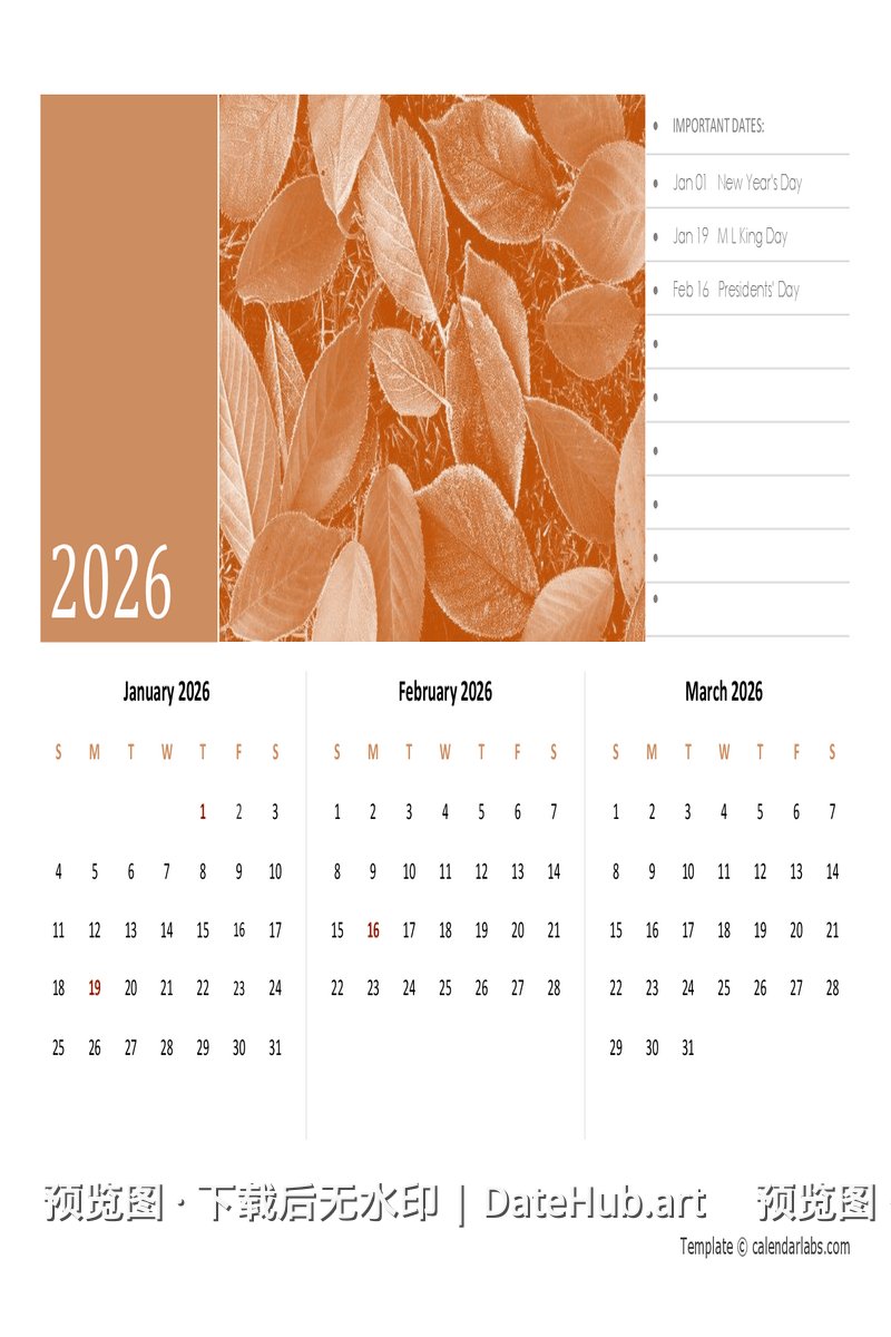 💡 提示:此日历为 2026 年版本,包含全年 12 个月份。 如需其他年份日历,请返回首页浏览更多选择。