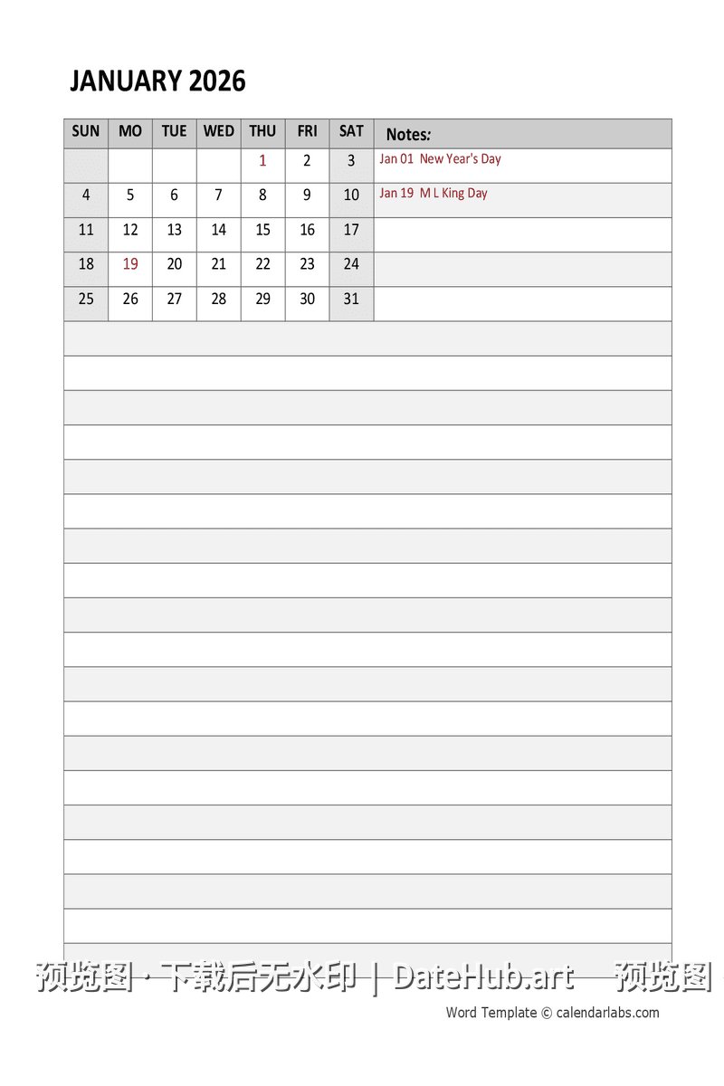 💡 提示:此日历为 2026 年版本,包含全年 12 个月份。 如需其他年份日历,请返回首页浏览更多选择。
