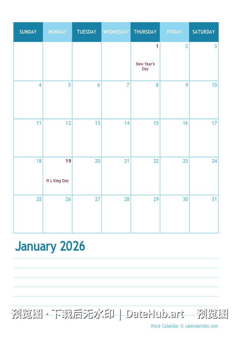 💡 提示:此日历为 2026 年版本,包含全年 12 个月份。 如需其他年份日历,请返回首页浏览更多选择。