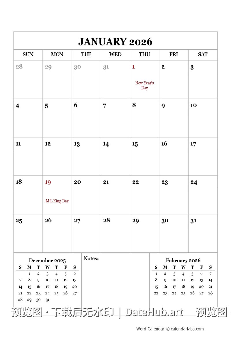 💡 提示:此日历为 2026 年版本,包含全年 12 个月份。 如需其他年份日历,请返回首页浏览更多选择。