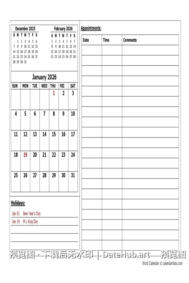 💡 提示:此日历为 2026 年版本,包含全年 12 个月份。 如需其他年份日历,请返回首页浏览更多选择。