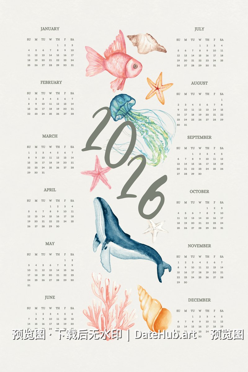 💡 提示:此日历为 2026 年版本,包含全年 12 个月份。 如需其他年份日历,请返回首页浏览更多选择。