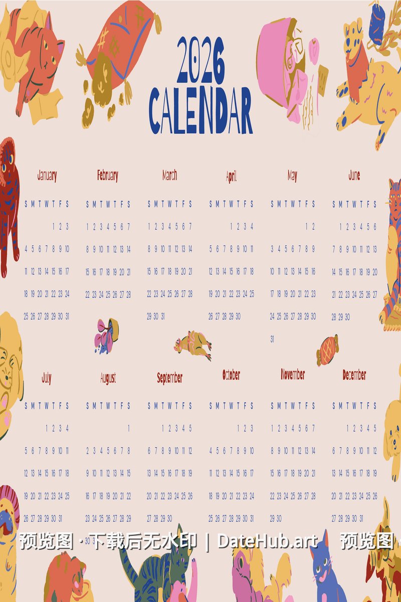 彩色活泼可爱猫狗插画2026日历