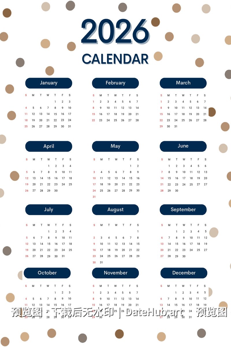 💡 提示:此日历为 2026 年版本,包含全年 12 个月份。 如需其他年份日历,请返回首页浏览更多选择。