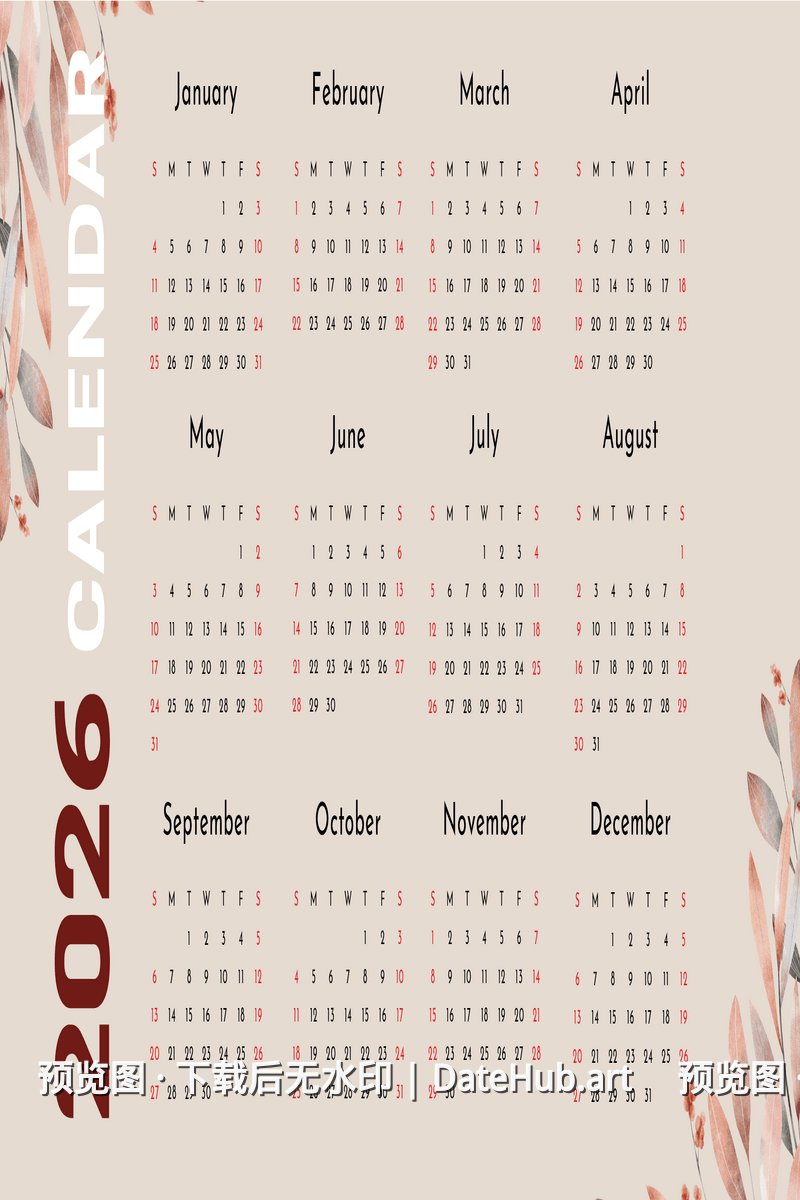 💡 提示:此日历为 2026 年版本,包含全年 12 个月份。 如需其他年份日历,请返回首页浏览更多选择。