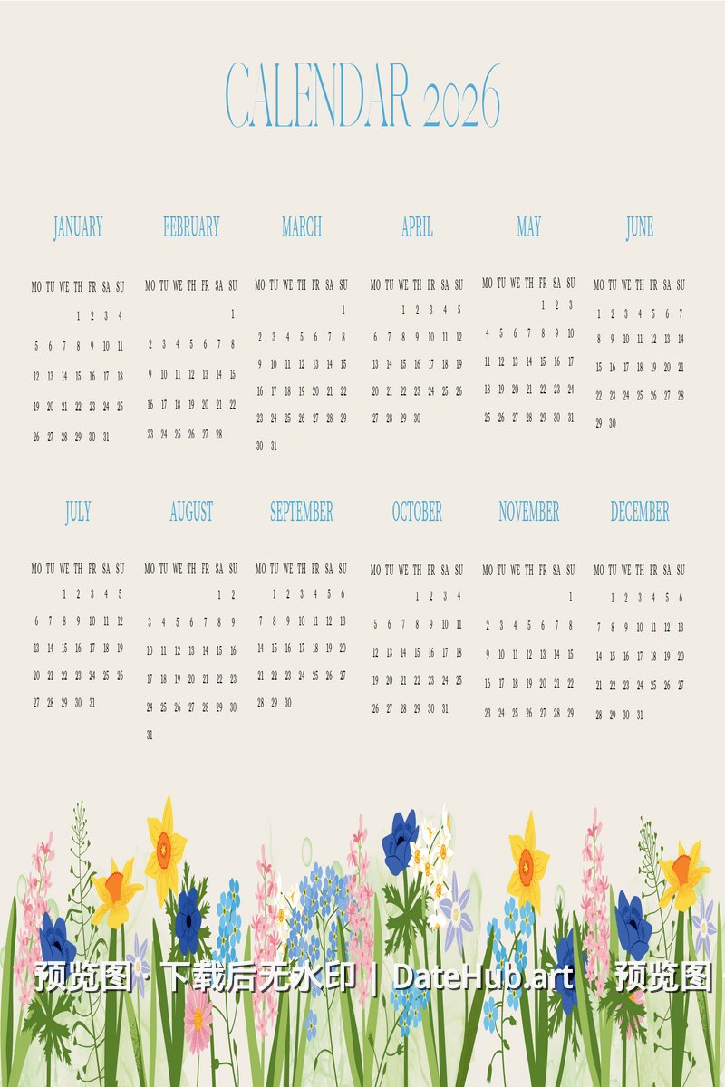 💡 提示:此日历为 2026 年版本,包含全年 12 个月份。 如需其他年份日历,请返回首页浏览更多选择。