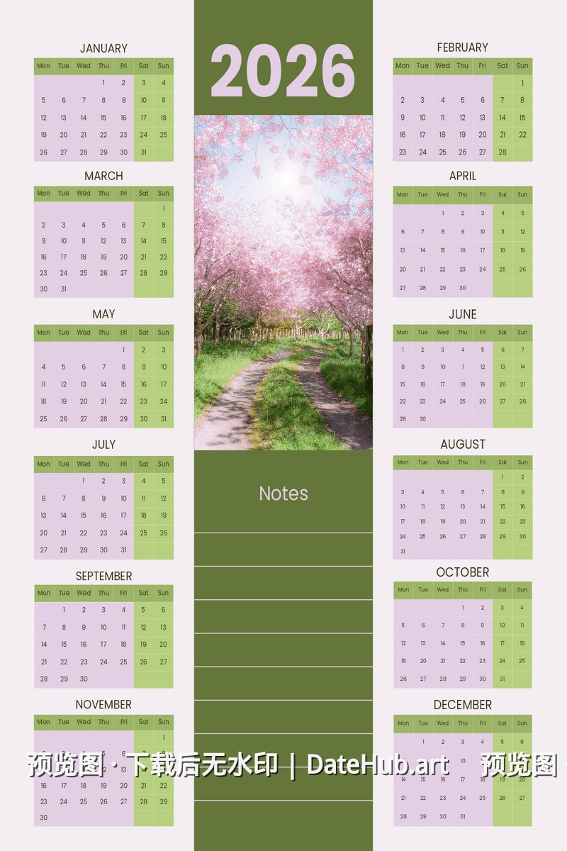💡 提示:此日历为 2026 年版本,包含全年 12 个月份。 如需其他年份日历,请返回首页浏览更多选择。