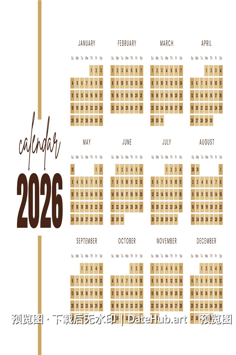 💡 提示:此日历为 2026 年版本,包含全年 12 个月份。 如需其他年份日历,请返回首页浏览更多选择。