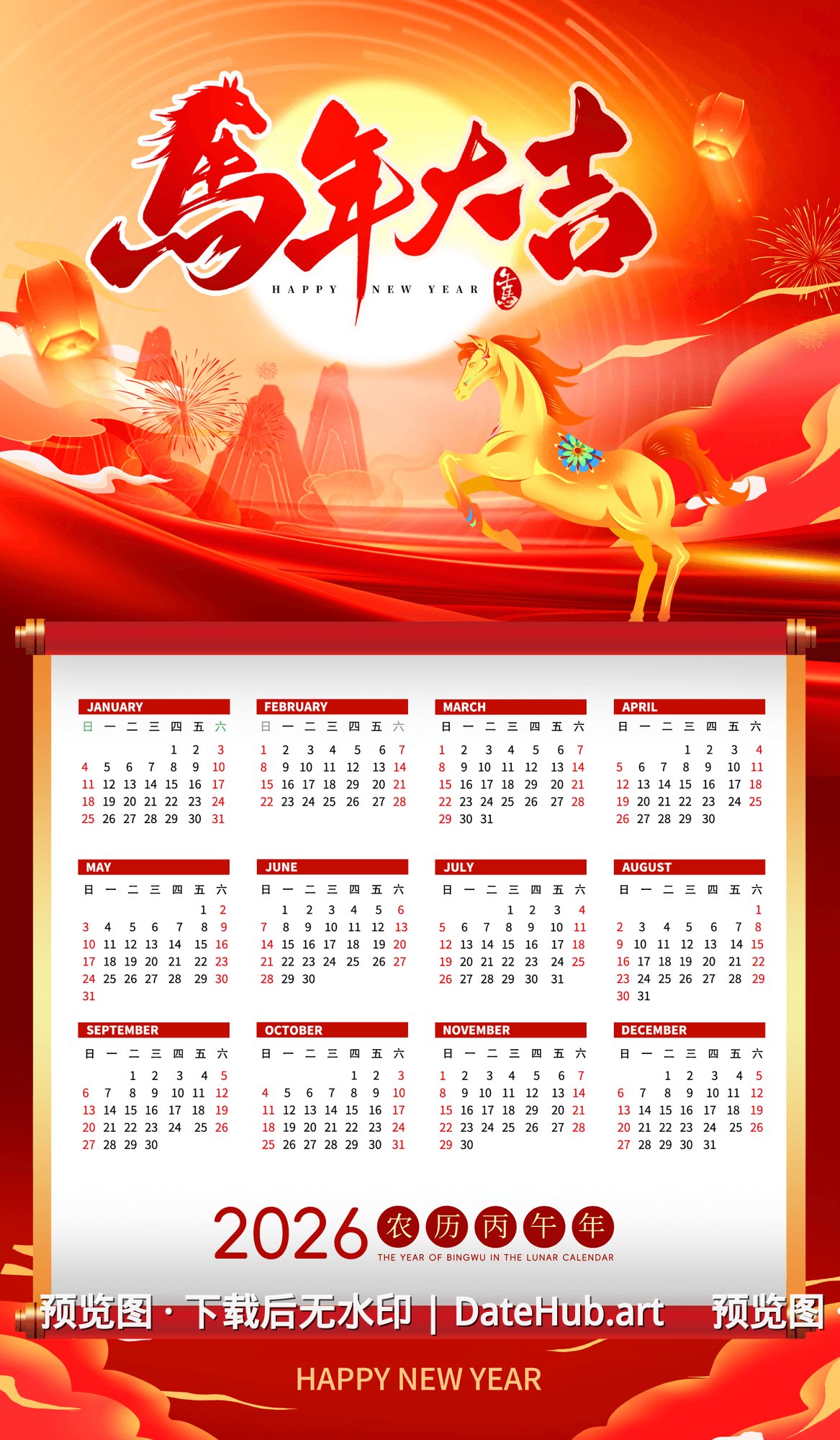 💡 提示:此日历为 2026 年版本,包含全年 12 个月份。 如需其他年份日历,请返回首页浏览更多选择。