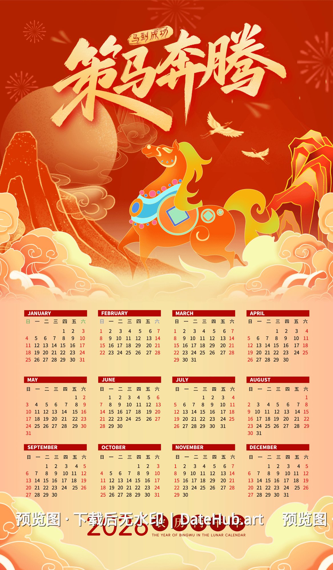 💡 提示:此日历为 2026 年版本,包含全年 12 个月份。 如需其他年份日历,请返回首页浏览更多选择。